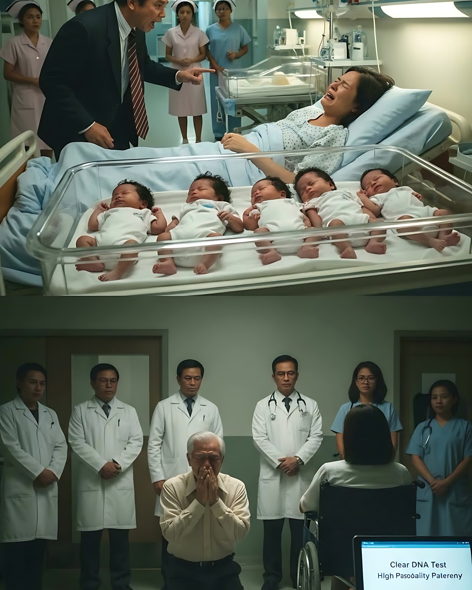 “Sino ang ama ng mga ‘yan?!” sigaw ni Roberto habang dinuduro si Isabella na nakahiga pa sa kama, nanghihina. “Niloko mo ako! May karelasyon kang iba! Siguro ay isang sundalong Amerikano o turista! Hindi akin ang mga ‘yan! Tingnan mo ang balat ko, maputi! Tingnan mo ikaw, kayumanggi! Paano tayo magkaka-anak ng ganyan kaitim?!”